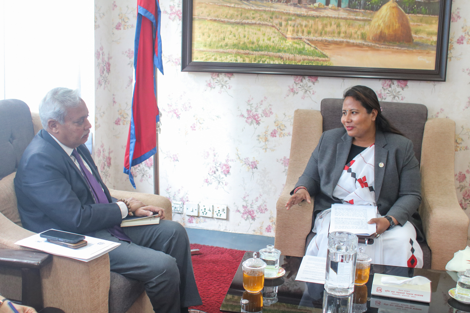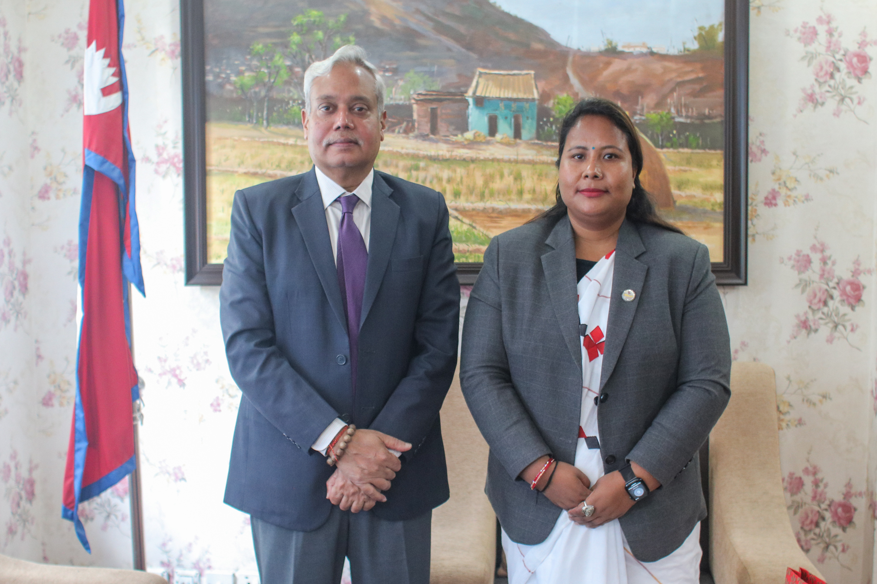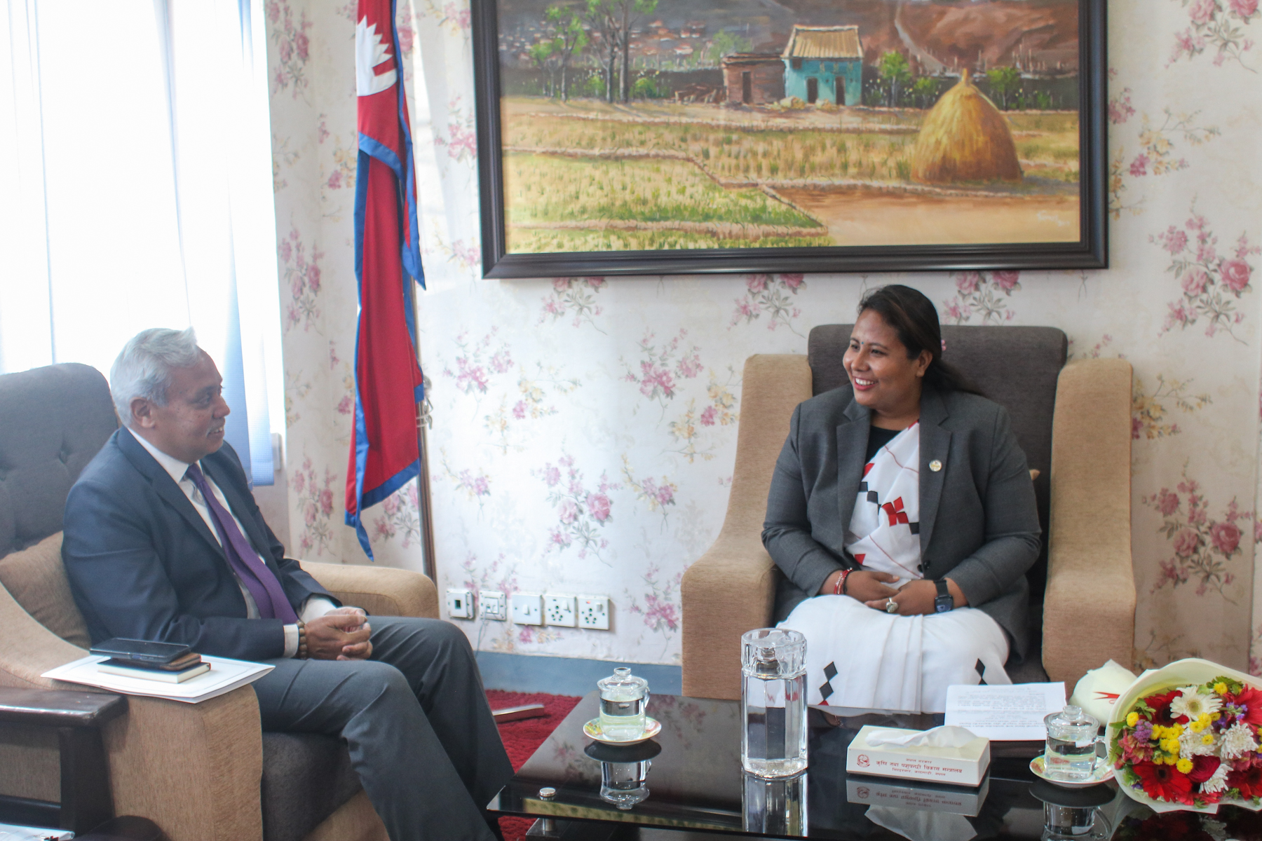 माननीय कृषि तथा पशुपन्छी विकास मन्त्री गीता चौधरीज्यू संग नेपालका लागि भारतीय राजदूत महामहिम श्री नवीन श्रीवास्तवले मन्त्रालयमा गर्नुभएको शिष्टाचार भेटघाट।