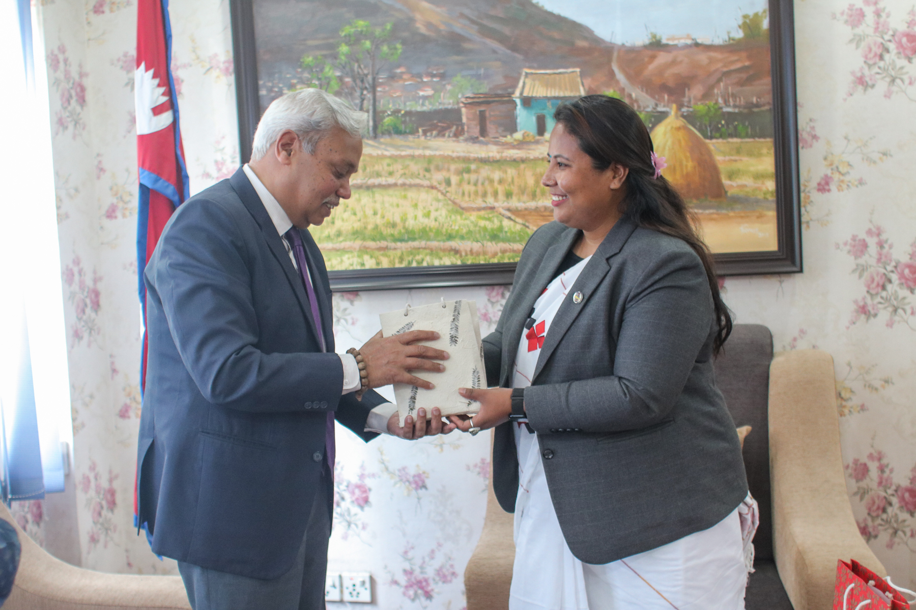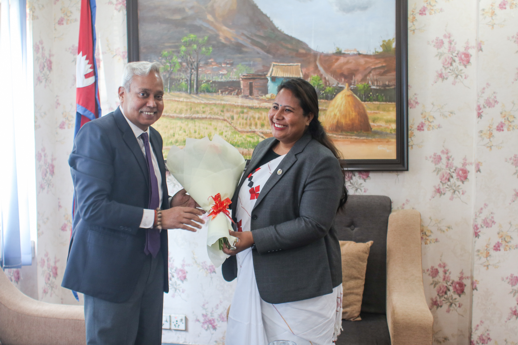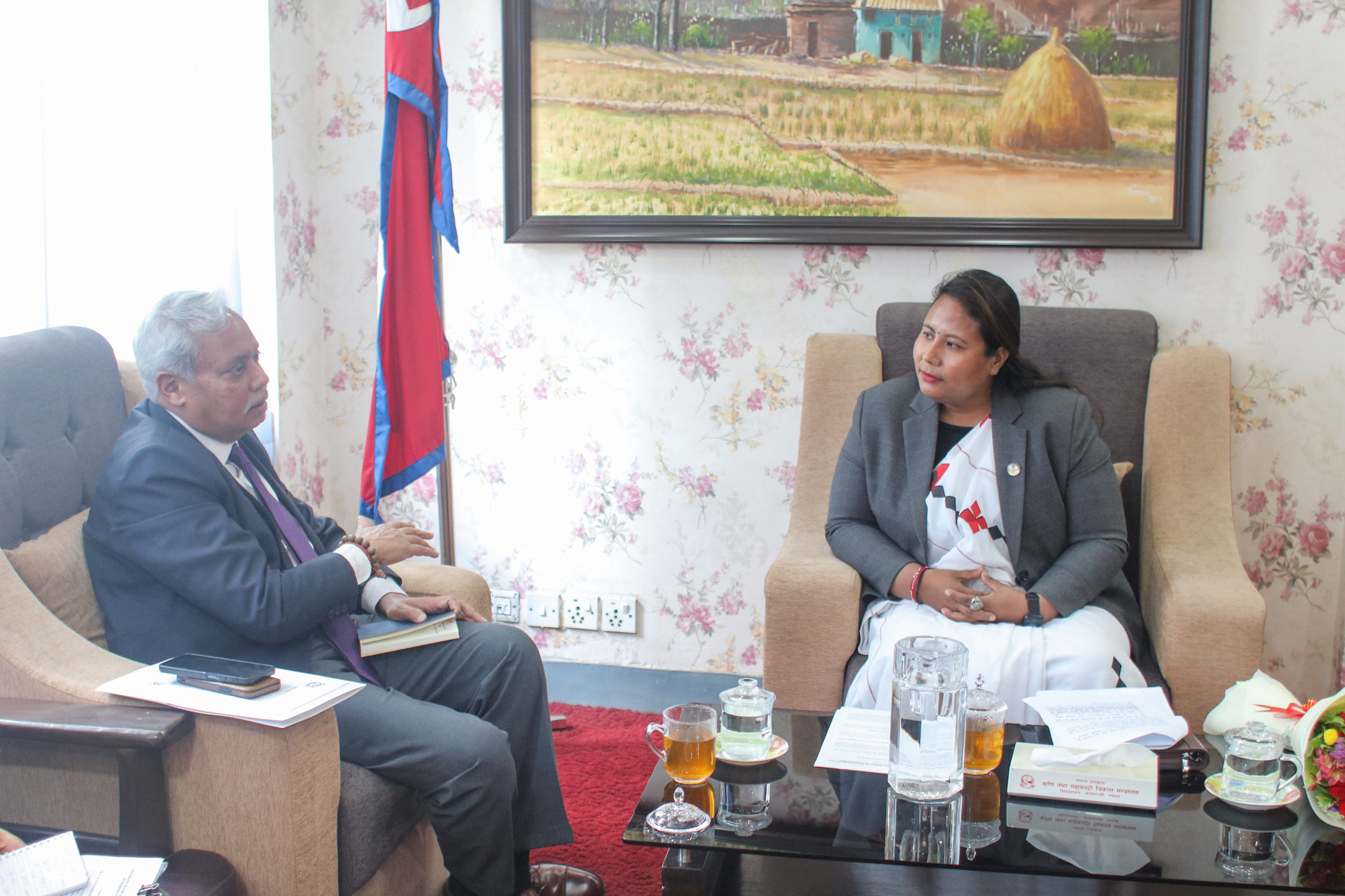 माननीय कृषि तथा पशुपन्छी विकास मन्त्री गीता चौधरीज्यू संग नेपालका लागि भारतीय राजदूत महामहिम श्री नवीन श्रीवास्तवले मन्त्रालयमा गर्नुभएको शिष्टाचार भेटघाट।